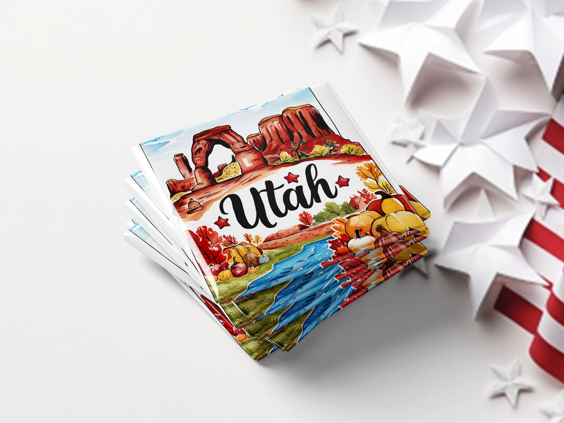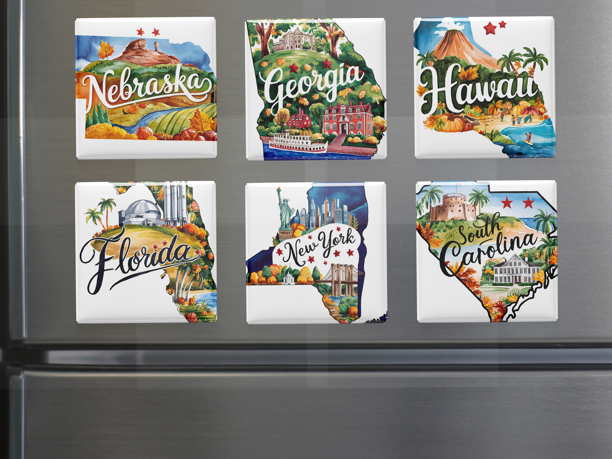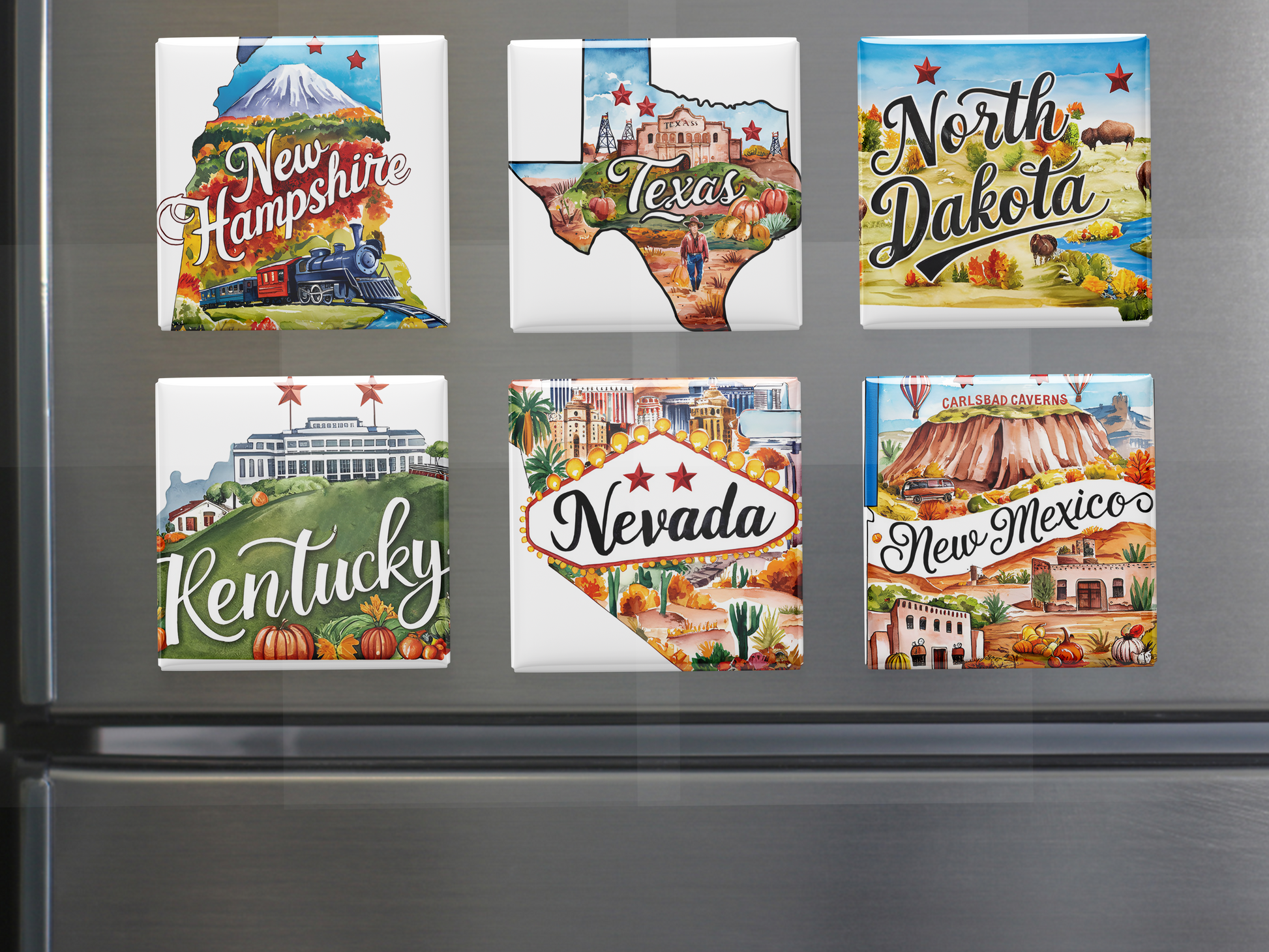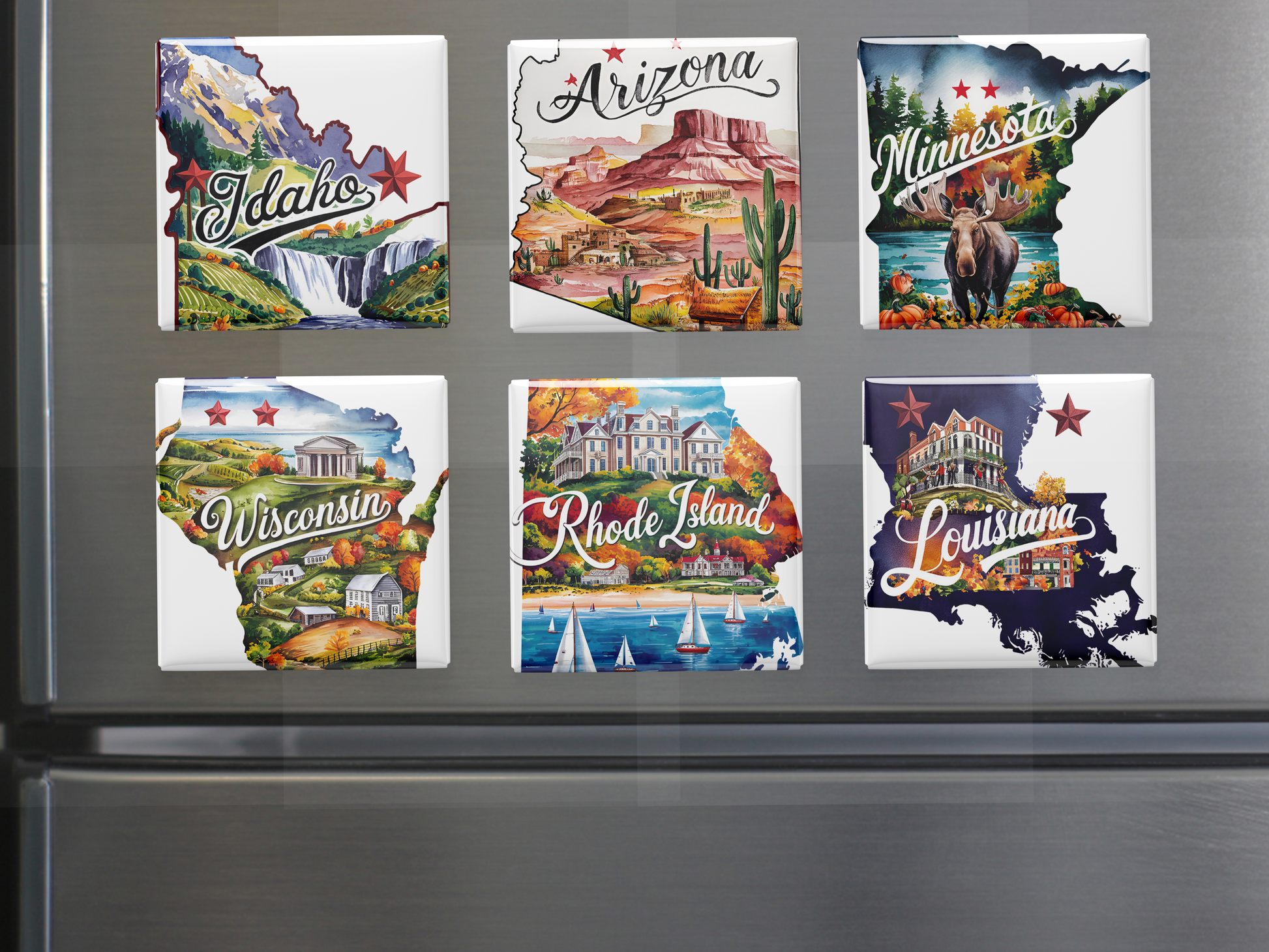 A collection of square 2x2" magnets, each printed with a unique design outlined by the state’s map shape. Choose your set size:
