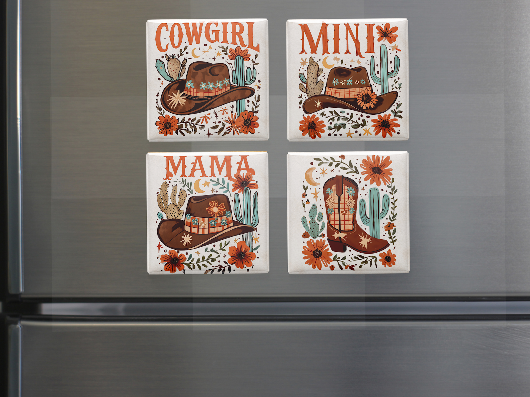 Set of 4 cowgirl-themed magnets: Mama, Mini, Cowgirl, and Cowgirl Boot design