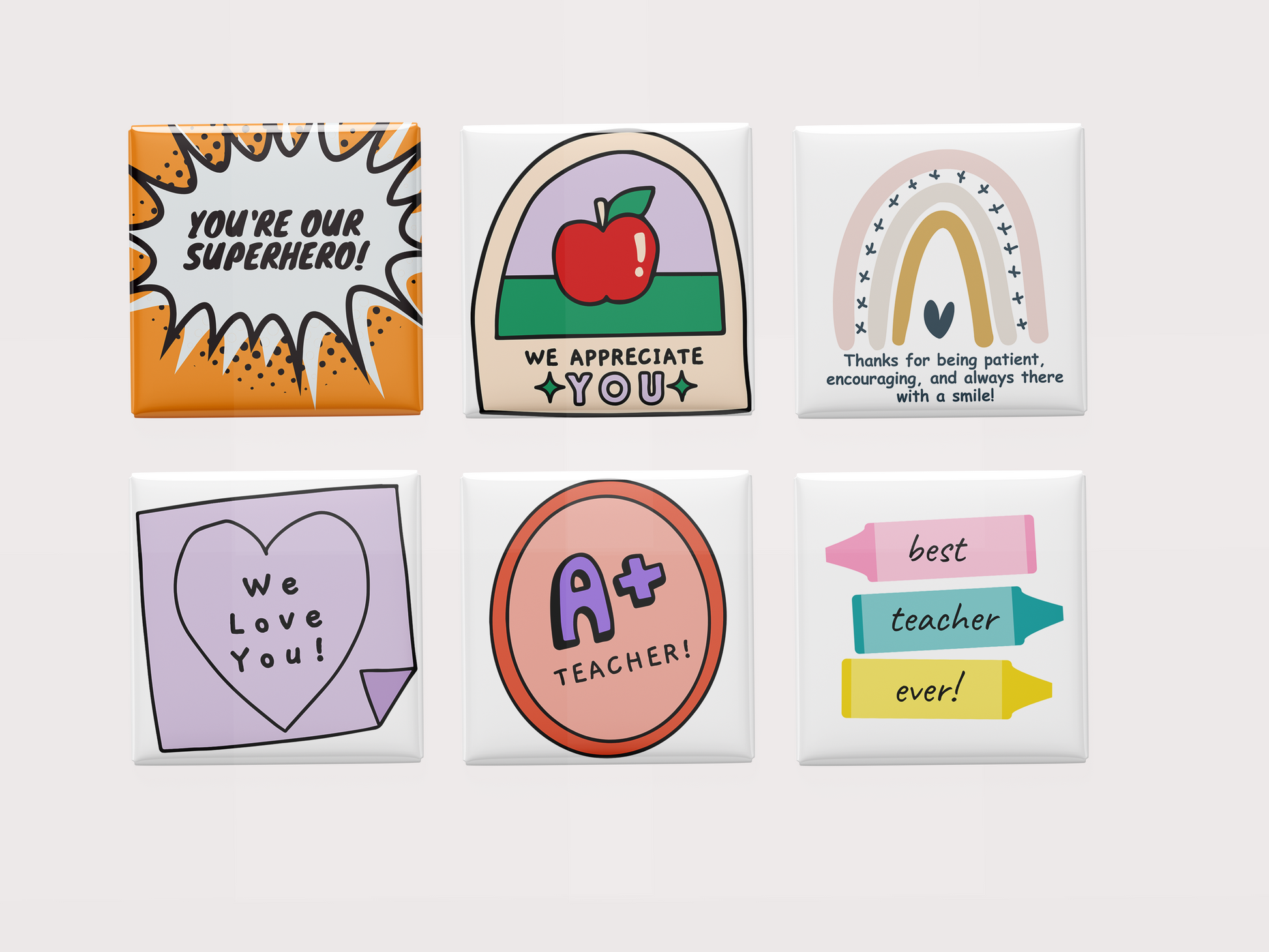 Show your gratitude in a meaningful (and magnetic!) way with this set of 6 ready-made Teacher Appreciation photo magnets. Thoughtfully designed with sweet, encouraging messages and cheerful designs, these magnets make perfect gifts for teachers during Teacher Appreciation Week, end-of-year celebrations, or just because!