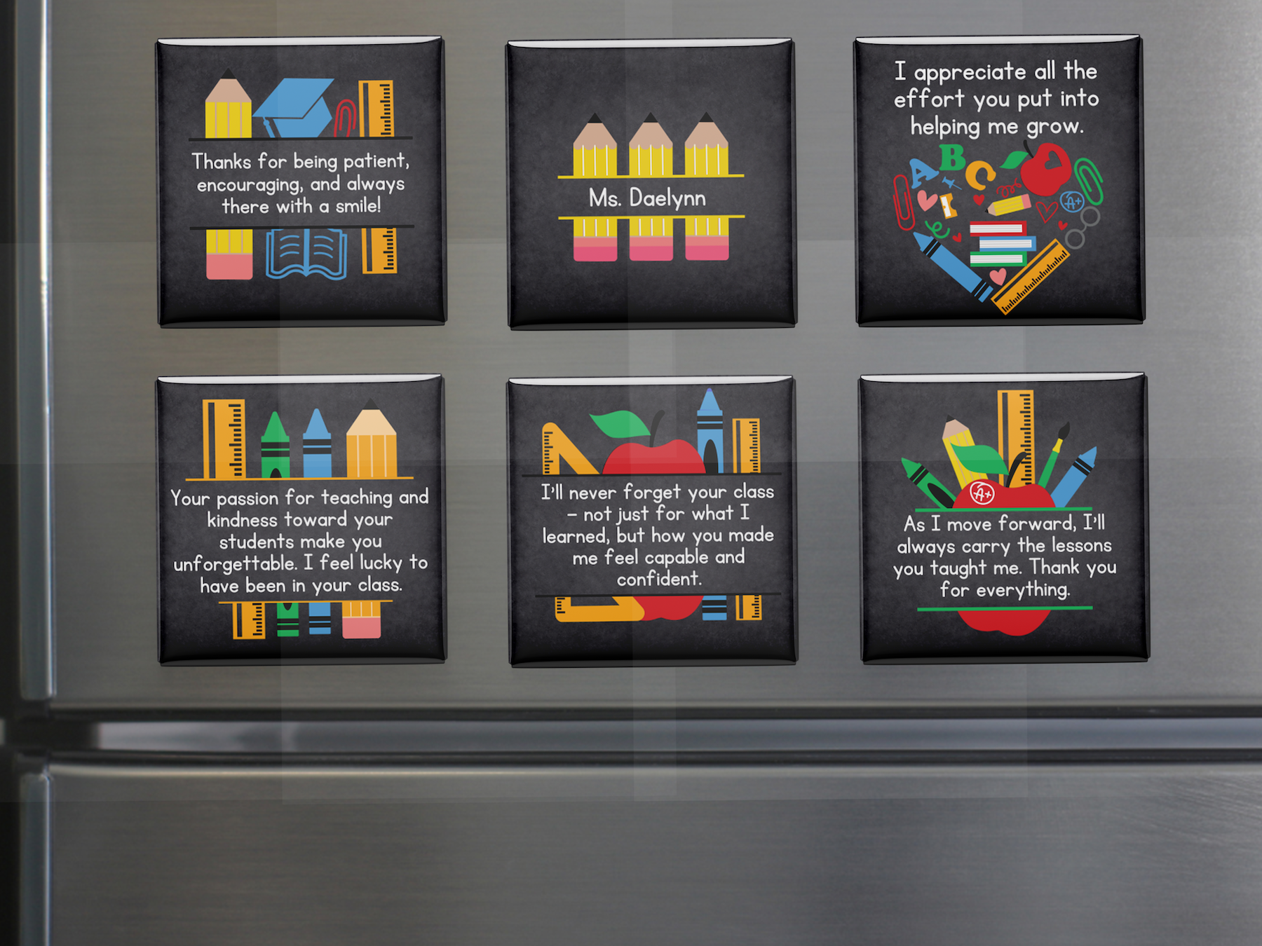 Celebrate the incredible impact of a teacher with this thoughtful set of 6 appreciation-themed fridge magnets. Five magnets feature ready-made, uplifting messages, and one is personalized with the teacher’s name for that special touch. No photos needed – just add the name and you’ve got a meaningful, ready-to-gift item perfect for Teacher Appreciation Week, end-of-year thank-yous, or holiday surprises!